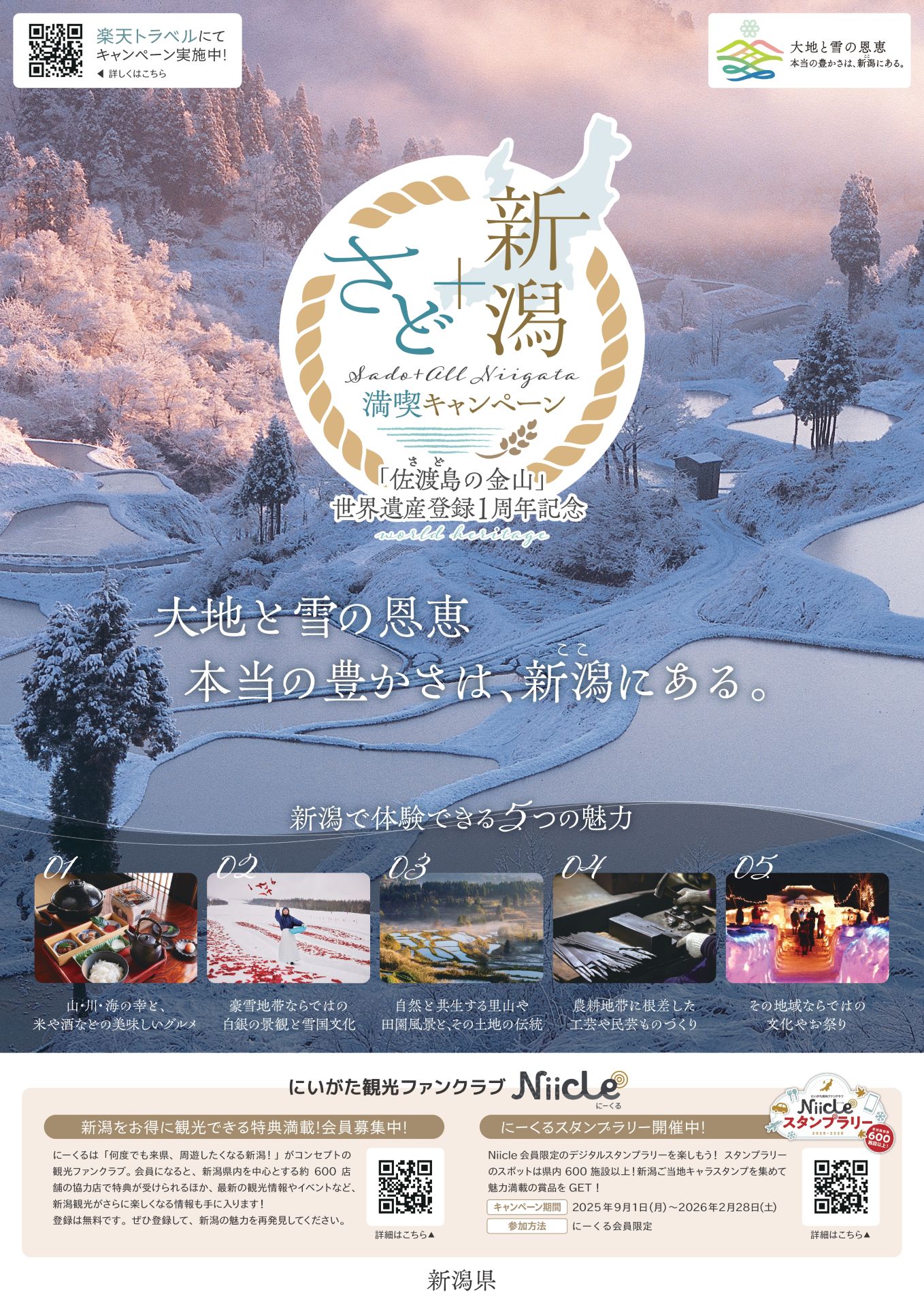 楽天トラベルの宿泊予約サイト内に新潟県特集ページが設置され、「大地と雪の恩恵」を体感できる記念宿泊プランが掲載されます。