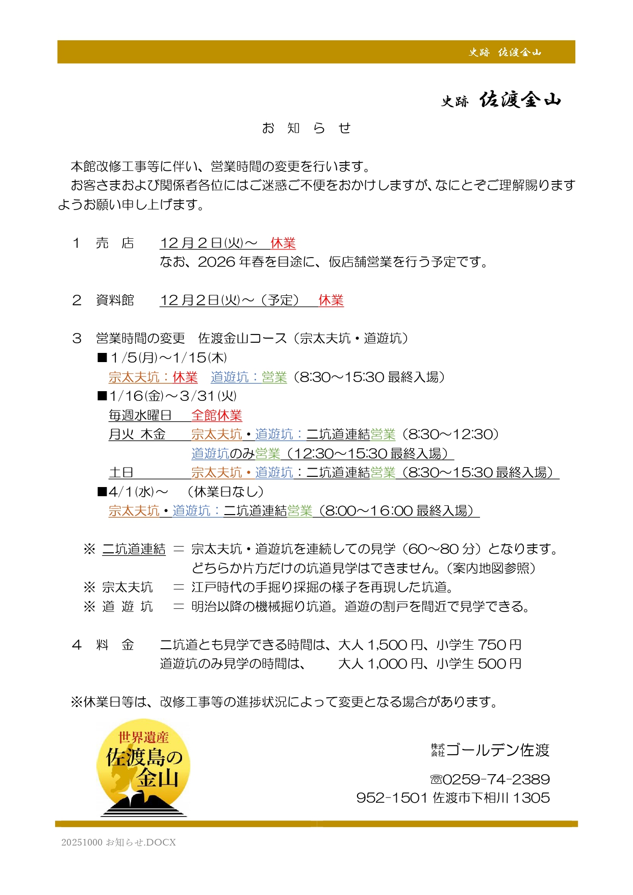 【重要】 史跡 佐渡金山 営業時間等の変更につきましてのお知らせ