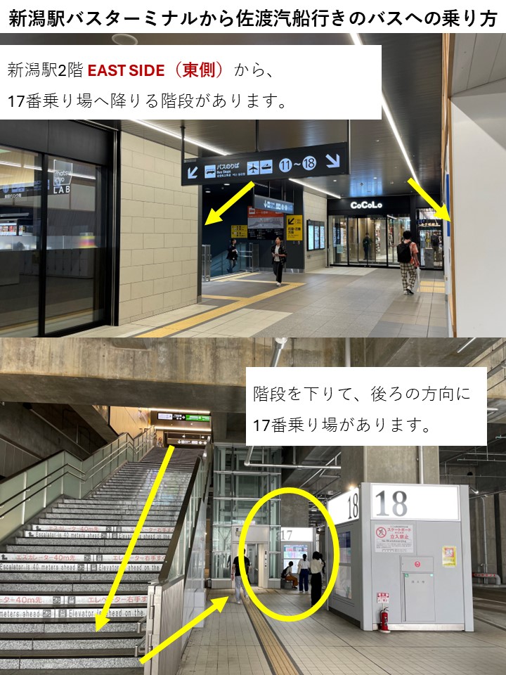 佐渡汽船新潟港へ向かうには、新潟駅バス乗り場「17番」を利用しましょう。(バス乗り場への行き方)