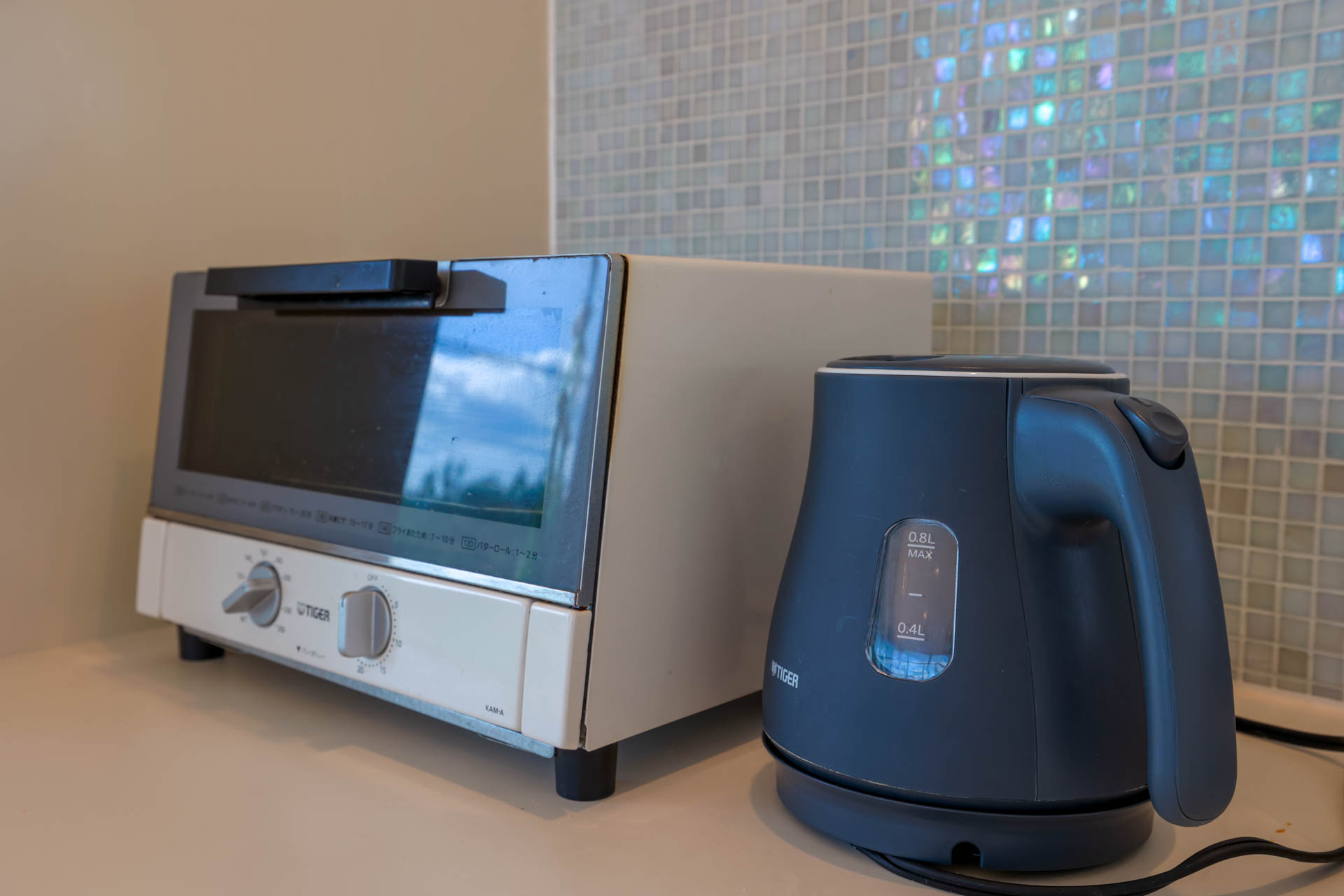開放的なラウンジと合わせて、キッチンには冷蔵庫やレンジなど生活家電も充実。